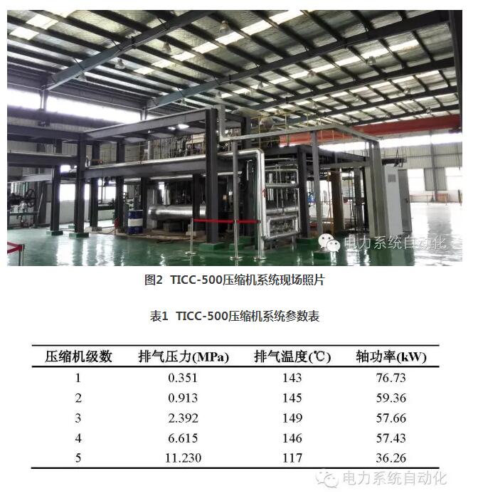 壓縮子系統(tǒng)的作用是利用電能將空氣壓縮至高壓,同時(shí)在壓縮過程中產(chǎn)生高溫的壓縮熱。其主要由壓縮機(jī)本體、附屬裝置等組成。通過壓縮子系統(tǒng),可以將電能轉(zhuǎn)換為高壓空氣的分子內(nèi)勢能和儲熱介質(zhì)的熱能,進(jìn)而完成電能的轉(zhuǎn)換。作為儲能過程中的核心部件,壓縮機(jī)具有流量大、壓比高、背壓變化大等特點(diǎn)。在TICC-500項(xiàng)目中,研發(fā)了基于雙作用活塞和自卸荷技術(shù)的非穩(wěn)態(tài)壓縮系統(tǒng),可以實(shí)現(xiàn)儲能過程中的壓縮機(jī)的高效運(yùn)行。壓縮機(jī)系統(tǒng)的照片如圖2所示,系統(tǒng)的參數(shù)配置如表1所示。