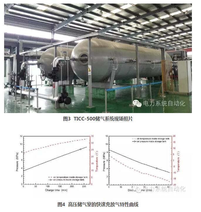 儲氣子系統(tǒng)是用來存儲壓縮機(jī)所產(chǎn)生的高壓空氣,實(shí)現(xiàn)分子內(nèi)勢能的存儲。其主要由儲氣罐、管道、閥門等組成。壓縮空氣儲能采用空氣作為儲能介質(zhì),儲氣系統(tǒng)具有容量大、壓力高等特點(diǎn)。TICC-500采用高壓鋼制壓力容器作為儲氣室,建設(shè)了兩臺總?cè)莘e為100立方米的10MPa高壓儲氣罐(如圖3所示),并完成了大容量高壓儲氣室的快速充放氣特性研究(如圖4所示)。