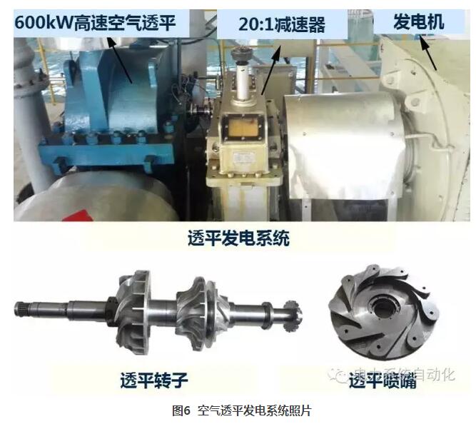 透平發(fā)電子系統(tǒng)利用儲氣系統(tǒng)存儲的高壓空氣和儲熱系統(tǒng)存儲的壓縮熱驅(qū)動透平膨脹機(jī)轉(zhuǎn)動,帶動發(fā)電機(jī)輸出電能,實(shí)現(xiàn)由分子內(nèi)勢能和熱能向電能的轉(zhuǎn)換。其主要由空氣透平膨脹機(jī)、減速器、發(fā)電機(jī)等組成??諝馔钙桨l(fā)電系統(tǒng)是釋能過程中熱功轉(zhuǎn)換的核心部件,其效率的高低直接決定著整個(gè)電站的儲能效率。TICC-500的空氣透平的設(shè)計(jì)輸出軸功率650kW,膨脹比高達(dá)30∶1,轉(zhuǎn)速30000轉(zhuǎn)/分鐘,通過減速器,將轉(zhuǎn)速降至1500轉(zhuǎn)/分鐘,驅(qū)動發(fā)電機(jī)對外輸出電能。由于空氣透平膨脹比大、轉(zhuǎn)速高,故對空氣透平的設(shè)計(jì)和制造具有較高的要求。TICC-500采用向心徑軸流式透平,三級同軸布置,利用回?zé)嵯到y(tǒng)實(shí)現(xiàn)三級再熱循環(huán),提高了系統(tǒng)的循環(huán)效率(如圖6所示)。