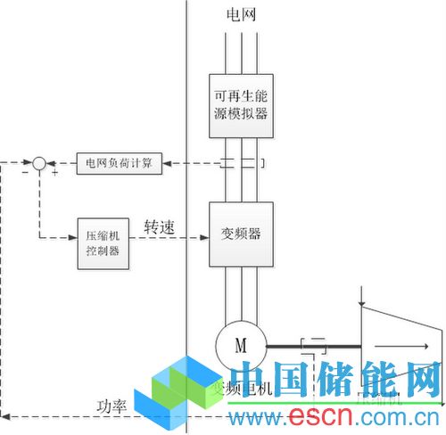 可再生能源模擬系統(tǒng)研究主要針對壓縮空氣儲能控制系統(tǒng)的試驗(yàn)和測試,依據(jù)可再生能源電站的電力輸出特性,建立了一套合理的電能模擬和運(yùn)行控制制度,使儲能系統(tǒng)能夠高效發(fā)揮自身的儲能功用,最大限度地提高聯(lián)合運(yùn)行的經(jīng)濟(jì)、技術(shù)效益。其原理如下圖所示,即利用模擬系統(tǒng)在實(shí)驗(yàn)室再現(xiàn)電壓/頻率波動、電力間歇供電等典型可再生能源電網(wǎng)真實(shí)運(yùn)行環(huán)境,為儲能系統(tǒng)提供電能。同時(shí)根據(jù)電網(wǎng)負(fù)荷和壓縮機(jī)部件功率差分計(jì)算結(jié)果,利用壓縮機(jī)控制器和變頻器實(shí)時(shí)控制壓縮機(jī)負(fù)荷,實(shí)現(xiàn)對不穩(wěn)定電能的存儲利用。