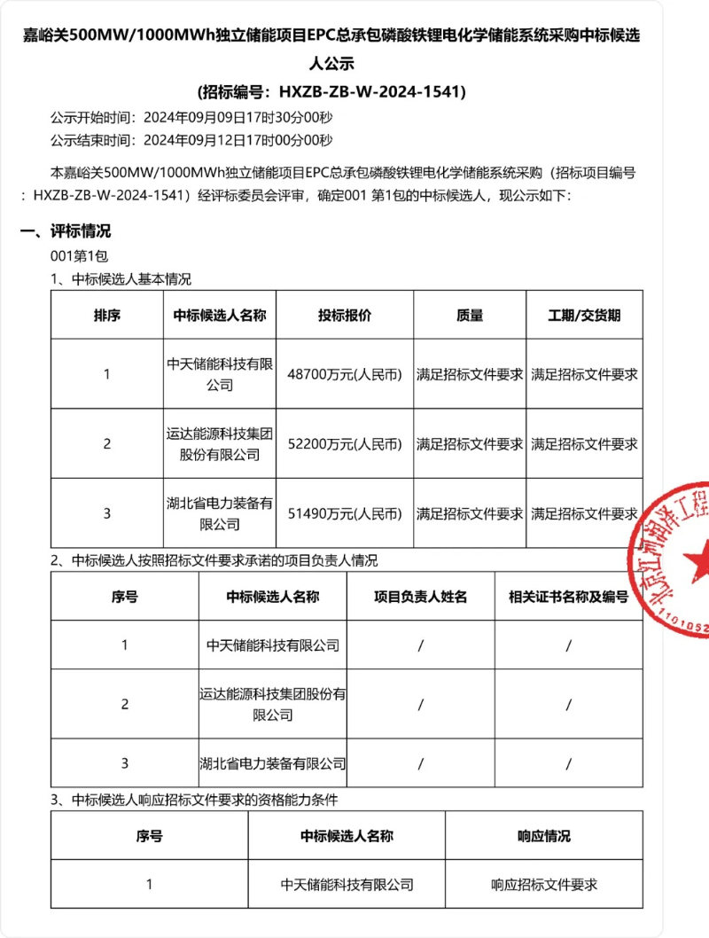第一中標(biāo)候選人:中天儲(chǔ)能科技有限公司,投標(biāo)報(bào)價(jià)48700萬(wàn)元,折合單價(jià)0.487元/Wh;