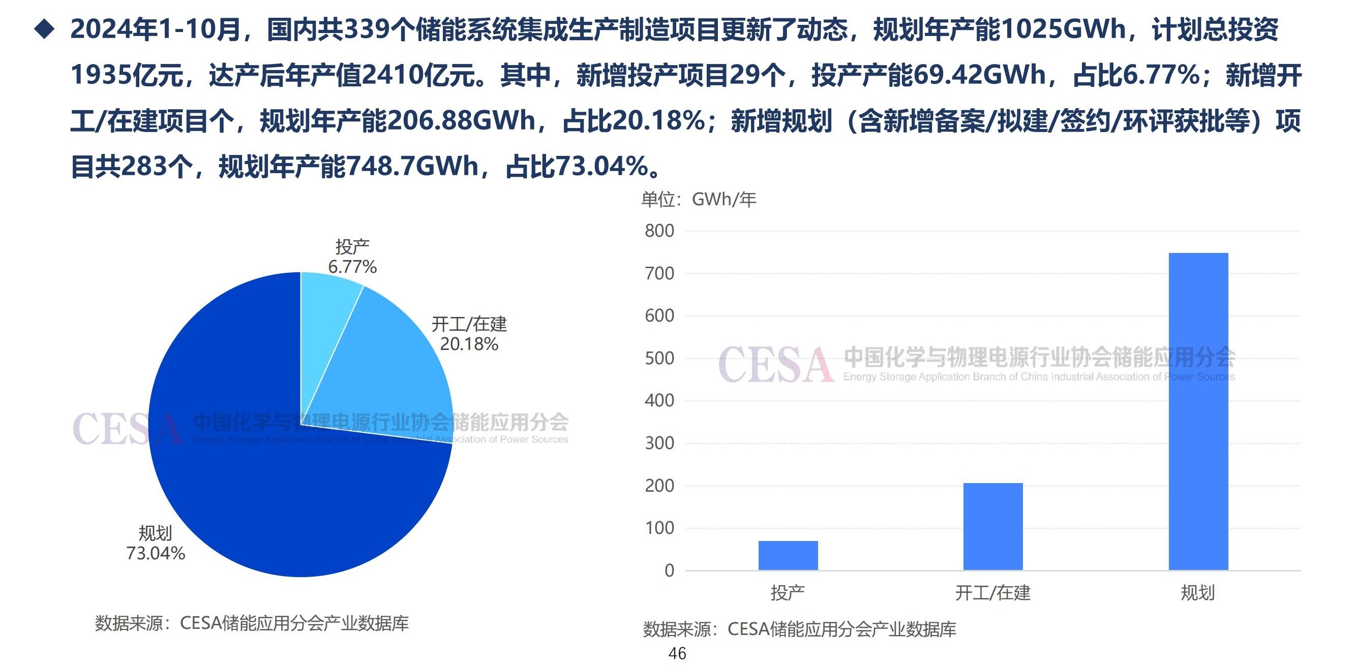 據(jù)CESA儲(chǔ)能應(yīng)用分會(huì)產(chǎn)業(yè)數(shù)據(jù)庫(kù)不完全統(tǒng)計(jì),2024年1-10月,國(guó)內(nèi)共339個(gè)儲(chǔ)能系統(tǒng)集成生產(chǎn)制造項(xiàng)目更新了動(dòng)態(tài),規(guī)劃年產(chǎn)能1025GWh,計(jì)劃總投資1935億元,達(dá)產(chǎn)后年產(chǎn)值2410億元。