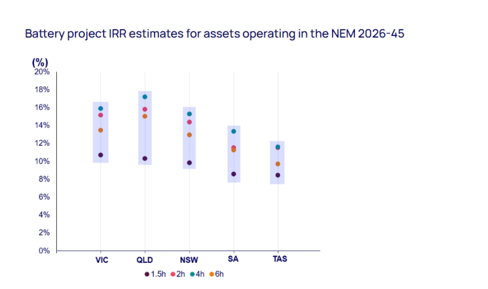 圖1澳大利亞國(guó)家電力市場(chǎng)(NEM)2026~2045年間運(yùn)營(yíng)電池儲(chǔ)能項(xiàng)目?jī)?nèi)部收益率