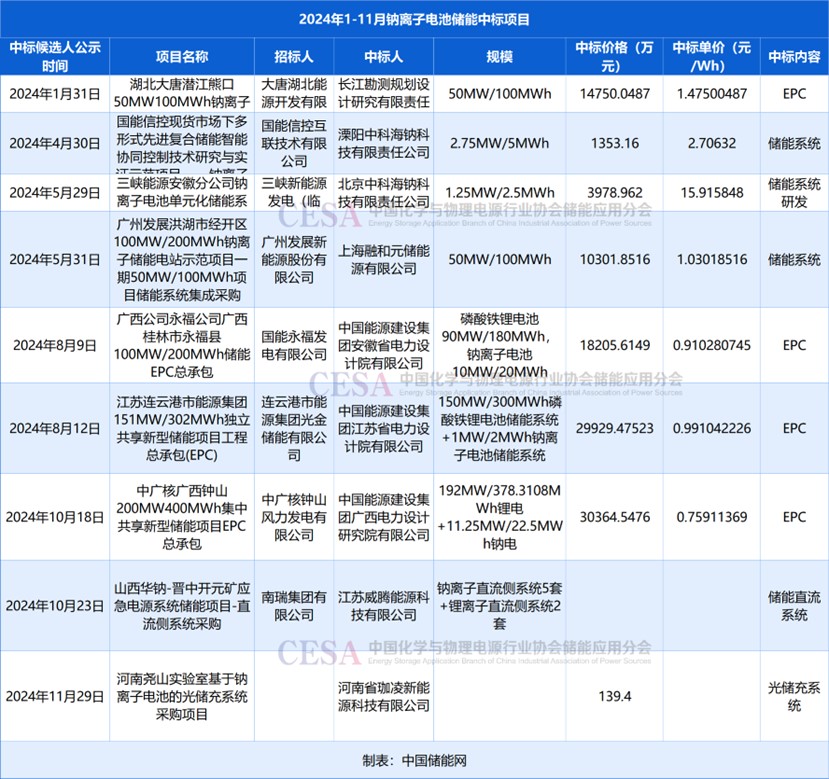 電站項目方面,據(jù)CESA儲能應(yīng)用分會產(chǎn)業(yè)數(shù)據(jù)庫不完全統(tǒng)計,2024年1-11月,鈉離子電池儲能采招落地規(guī)模126.25MW/251.75MWh。2024年1-11月,鈉離子電池儲能項目并網(wǎng)規(guī)模66.8MW/151.57MWh。