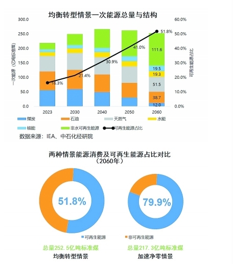 根據(jù)報(bào)告,均衡轉(zhuǎn)型情景下,一次能源消費(fèi)將于2045年前達(dá)到峰值267.1億噸標(biāo)準(zhǔn)煤(以發(fā)電煤耗法統(tǒng)計(jì),下同),可再生能源占比逐步上升至2060年的51.8%。能源消費(fèi)增速逐步放緩,到2060年為252.5億噸標(biāo)準(zhǔn)煤,油氣共計(jì)占比為35.7%。加速凈零情景則要求能源消費(fèi)達(dá)峰提前到2035年(241.6億噸標(biāo)準(zhǔn)煤)。需要加快可再生能源發(fā)展并形成集約化的能源生產(chǎn)利用方式,到2060年可再生能源占比達(dá)到79.9%,油氣共計(jì)占比為10.1%。