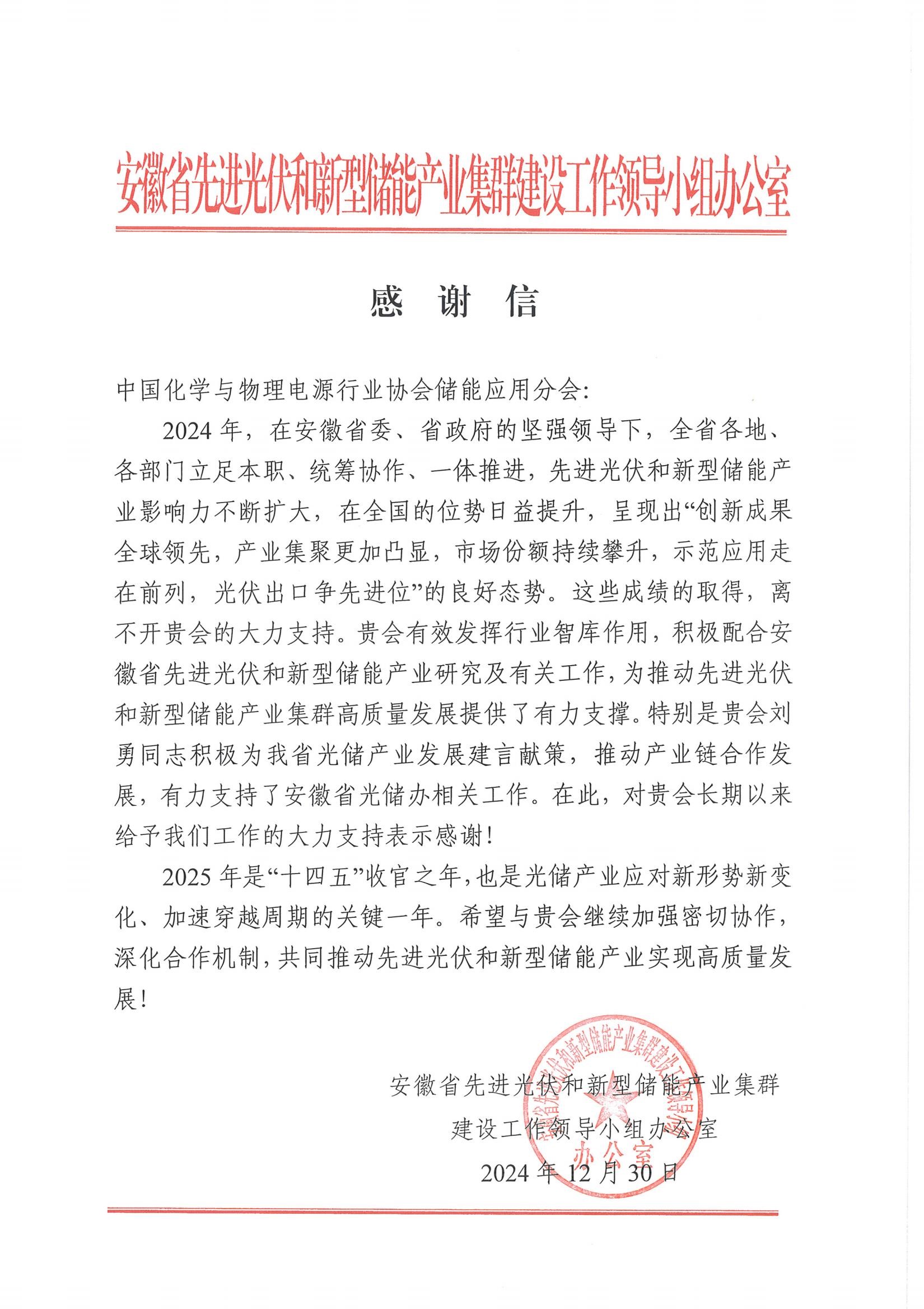中國儲(chǔ)能網(wǎng)訊:12月30日,安徽省先進(jìn)光伏和新型儲(chǔ)能產(chǎn)業(yè)集群建設(shè)工作領(lǐng)導(dǎo)小組辦公室向我會(huì)致感謝信。