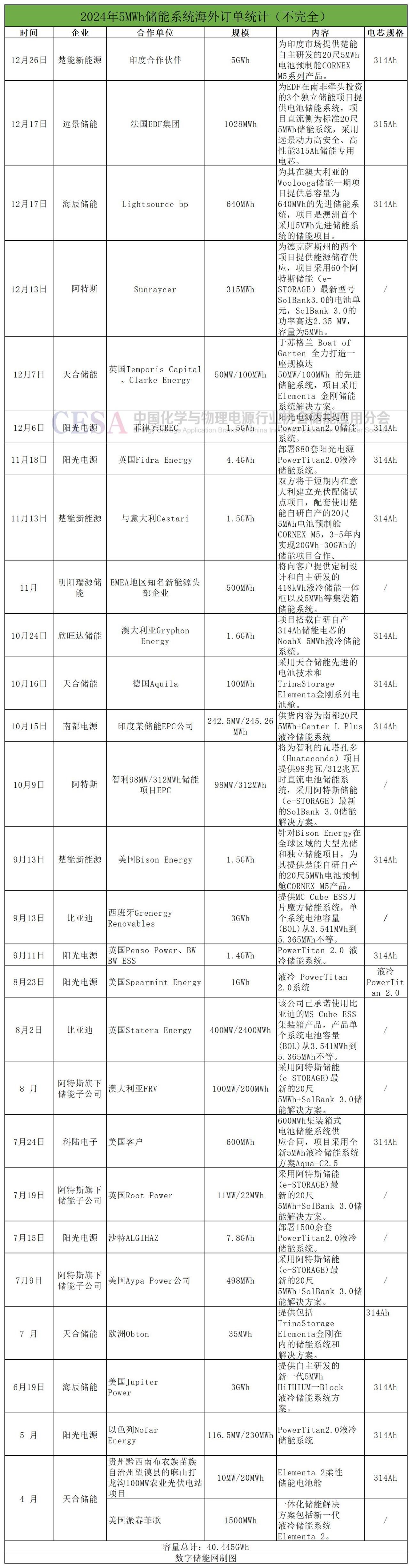 據(jù)中國(guó)儲(chǔ)能網(wǎng)不完全統(tǒng)計(jì),2024年,儲(chǔ)能系統(tǒng)廠商出海收獲的涉及5MWh儲(chǔ)能系統(tǒng)訂單超近40.445GWh。