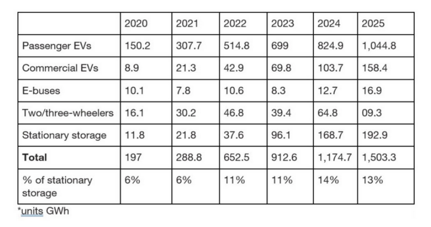 2020~2025年全球各類應(yīng)用的電池生產(chǎn)量(GWh)