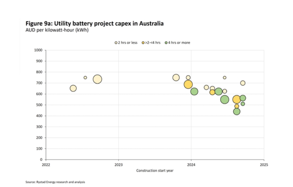 Rystad Energy公司在報告指出,自從2023年8月以來,電池儲能項目資本支出在12個月內(nèi)下降了33%。2024年部署的電池儲能項目資本支出將在450澳元/kWh至600澳元/kWh之間,這與澳大利亞國家科學機構(gòu)估計的423澳元/kWh相符。