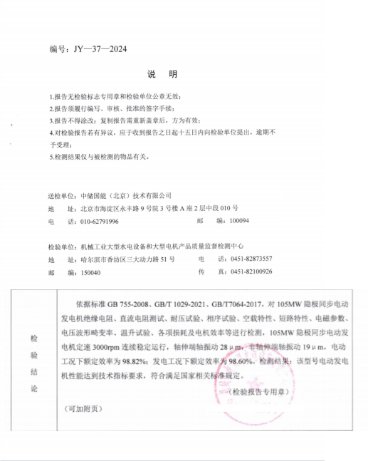 權(quán)威CMA第三方檢驗報告表明:依據(jù)國標(biāo)歷時近3個月的檢驗時間內(nèi),中儲國能山東肥城的300MW先進壓縮空氣儲能系統(tǒng)核心設(shè)備開展了包括耐壓試驗、空載特性、電機效率在內(nèi)的十余項型式試驗,設(shè)備性能表現(xiàn)卓越。
