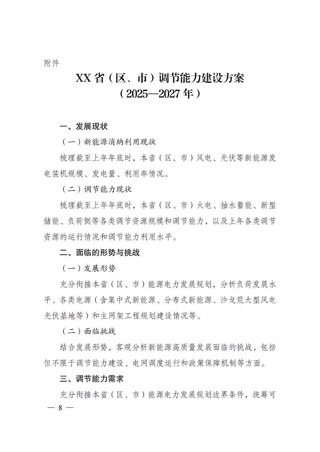 為進(jìn)一步落實(shí)《加快構(gòu)建新型電力系統(tǒng)行動(dòng)方案(2024—2027年)》和《關(guān)于加強(qiáng)電網(wǎng)調(diào)峰儲(chǔ)能和智能化調(diào)度能力建設(shè)的指導(dǎo)意見(jiàn)》,著力提升電力系統(tǒng)調(diào)節(jié)能力和調(diào)用水平,有效支撐新能源消納利用,國(guó)家發(fā)展改革委、國(guó)家能源局制定了《電力系統(tǒng)調(diào)節(jié)能力優(yōu)化專項(xiàng)行動(dòng)實(shí)施方案(2025—2027年)》。現(xiàn)印發(fā)給你們,請(qǐng)認(rèn)真組織落實(shí),因地制宜推進(jìn)調(diào)節(jié)能力建設(shè)。