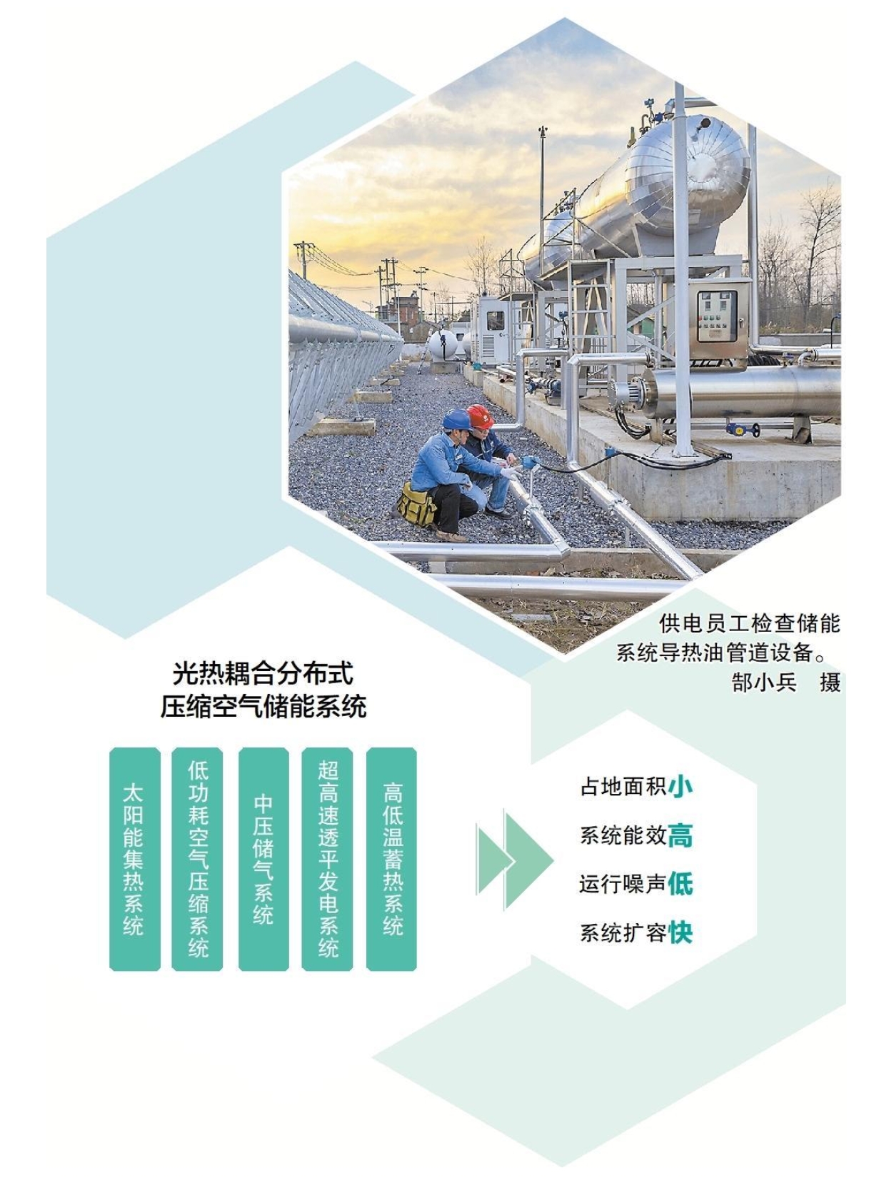 節(jié)省空間的同時,光熱耦合分布式壓縮空氣儲能系統(tǒng)的綜合效率也進(jìn)一步提升。該系統(tǒng)應(yīng)用了“冷-熱-氣-電”多能流靈活優(yōu)化管控方法,極大提升了小型化壓縮空氣儲能系統(tǒng)的綜合運行效率,有效促進(jìn)胥壩島分布式光伏發(fā)電電量就地消納。