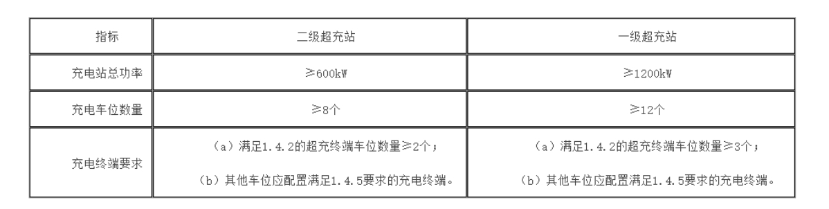 2.獨立占地的超充站,二級超充站充電區(qū)域占地面積不低于200平米(不含供配電和其他配套設(shè)施);一級超充站充電區(qū)域占地面積不低于300平米(不含供配電和其他配套設(shè)施)。