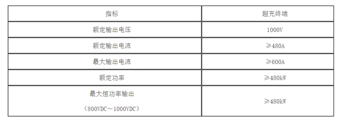至少配置一個車輛插頭,其單槍輸出電壓1000V,最大輸出電流不少于600A,800VDC~1000VDC范圍最大恒功率輸出不少于480kW,詳見表1。