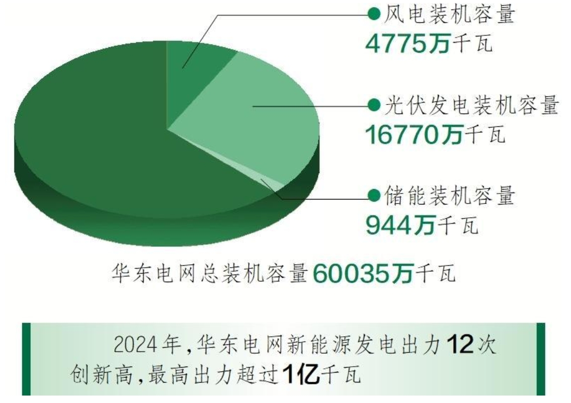 近年來,華東電網(wǎng)網(wǎng)內(nèi)電源結(jié)構(gòu)持續(xù)調(diào)整,燃煤、核電、抽水蓄能裝機(jī)容量持續(xù)增長,新能源電力快速發(fā)展,裝機(jī)規(guī)模不斷增長。2024年,華東電網(wǎng)新能源發(fā)電出力12次創(chuàng)新高,最高出力超過1億千瓦。