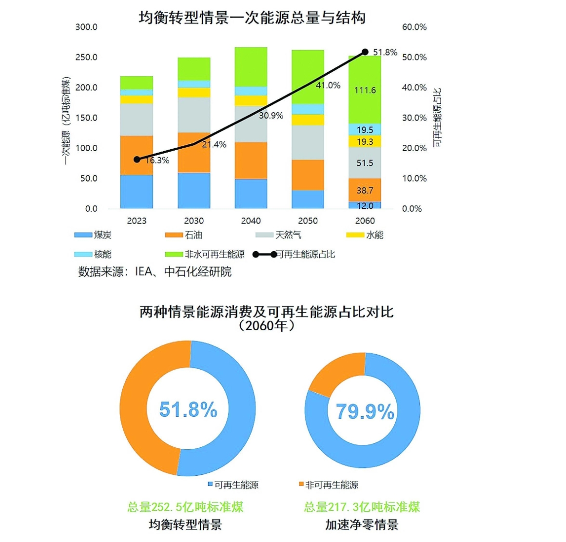 根據(jù)報(bào)告,均衡轉(zhuǎn)型情景下,一次能源消費(fèi)將于2045年前達(dá)到峰值267.1億噸標(biāo)準(zhǔn)煤(以發(fā)電煤耗法統(tǒng)計(jì),下同),可再生能源占比逐步上升至2060年的51.8%。能源消費(fèi)增速逐步放緩,到2060年為252.5億噸標(biāo)準(zhǔn)煤,油氣共計(jì)占比為35.7%。加速凈零情景則要求能源消費(fèi)達(dá)峰提前到2035年(241.6億噸標(biāo)準(zhǔn)煤)。需要加快可再生能源發(fā)展并形成集約化的能源生產(chǎn)利用方式,到2060年可再生能源占比達(dá)到79.9%,油氣共計(jì)占比為10.1%。