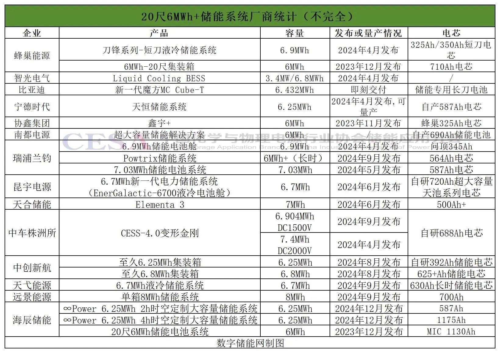 2024年4月,寧德時代發(fā)布6.25MWh儲能系統(tǒng),引領系統(tǒng)集成賽道迅速向6MWh+儲能系統(tǒng)更新迭代,據中國儲能網不完全統(tǒng)計,2024年以來共有14家企業(yè)發(fā)布了21個6MWh+儲能系統(tǒng)產品。