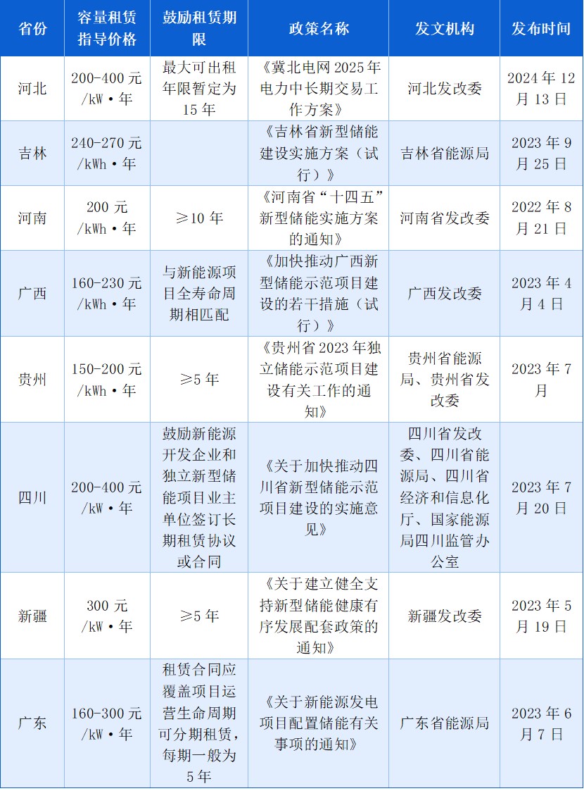 2024年8月,河北省發(fā)改委發(fā)布的《關(guān)于促進(jìn)獨(dú)立儲(chǔ)能加快發(fā)展有關(guān)事項(xiàng)的通知》明確提出,自2024年9月30日起,未開工新能源項(xiàng)目需配建儲(chǔ)能的,鼓勵(lì)優(yōu)先通過租賃方式配置儲(chǔ)能,不再單獨(dú)配建容量低于10萬千瓦/20萬千瓦時(shí)的儲(chǔ)能設(shè)施。獨(dú)立儲(chǔ)能可在同一省級電網(wǎng)區(qū)域向新能源項(xiàng)目出租容量,不受市域限制。12月,河北發(fā)改委發(fā)布《冀北電網(wǎng)2025年電力中長期交易工作方案》,其中明確,獨(dú)立儲(chǔ)能參與容量租賃交易,2025年交易價(jià)格上、下限暫定400、200元/千瓦·年。交易合同價(jià)格經(jīng)購售雙方協(xié)商一致后,每年可修改一次。