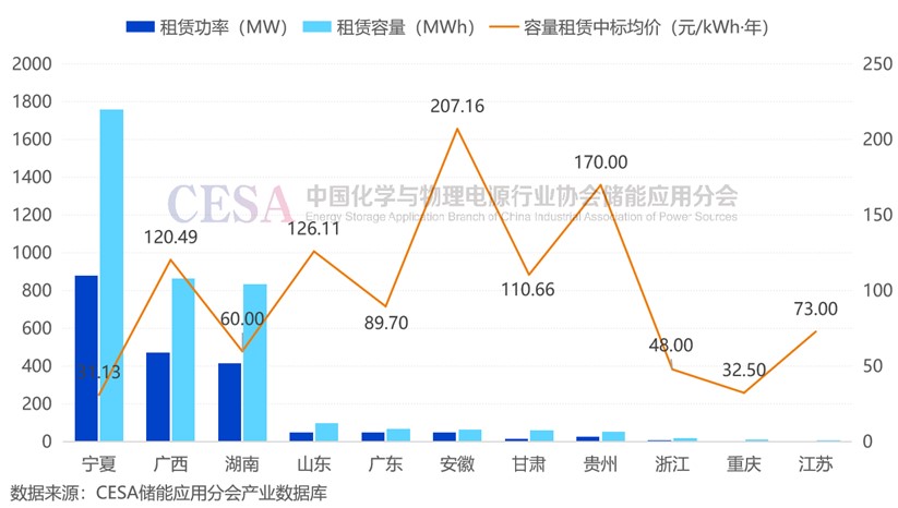 不同省份容量租賃價(jià)格差異巨大,容量租賃中標(biāo)均價(jià)最低的省份是寧夏,加權(quán)均價(jià)為31.13元/kWh·年,中標(biāo)單價(jià)主要集中在20-161.25元/kWh·年區(qū)間內(nèi)。
