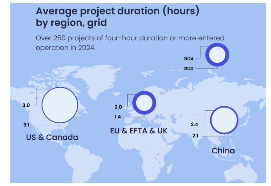 與此同時(shí),全球部署的儲(chǔ)能項(xiàng)目平均持續(xù)時(shí)間也在增加,尤其是歐洲的增長(zhǎng)尤為顯著,首次超過(guò)2小時(shí)(而2023年僅為1.4小時(shí))。2024年,美國(guó)和加拿大部署的儲(chǔ)能項(xiàng)目平均持續(xù)時(shí)間為3個(gè)小時(shí)以上。系統(tǒng)持續(xù)時(shí)間與盈利能力相匹配,這在美國(guó)兩大儲(chǔ)能市場(chǎng)中均有所體現(xiàn):德克薩斯州部署的儲(chǔ)能項(xiàng)目平均持續(xù)時(shí)間為1.7小時(shí),而加利福尼亞州則接近4小時(shí)。