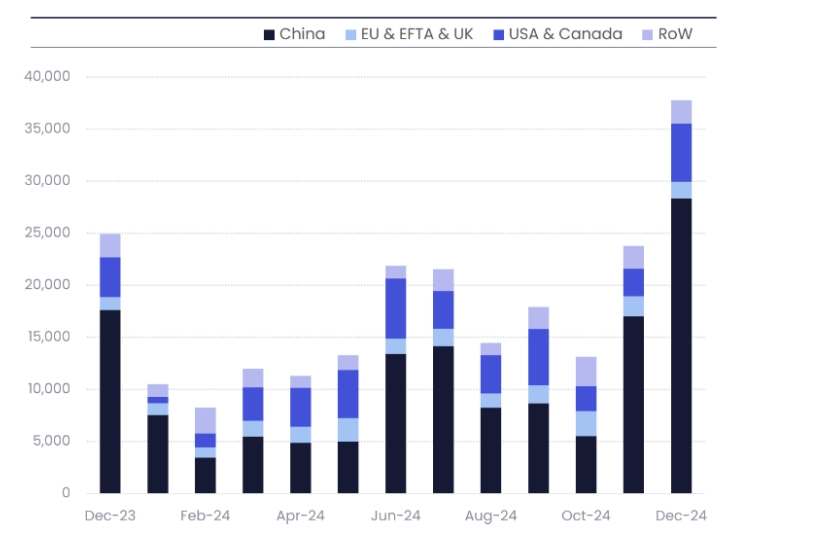 圖12024年全球各地每月部署的儲(chǔ)能系統(tǒng)(MW)