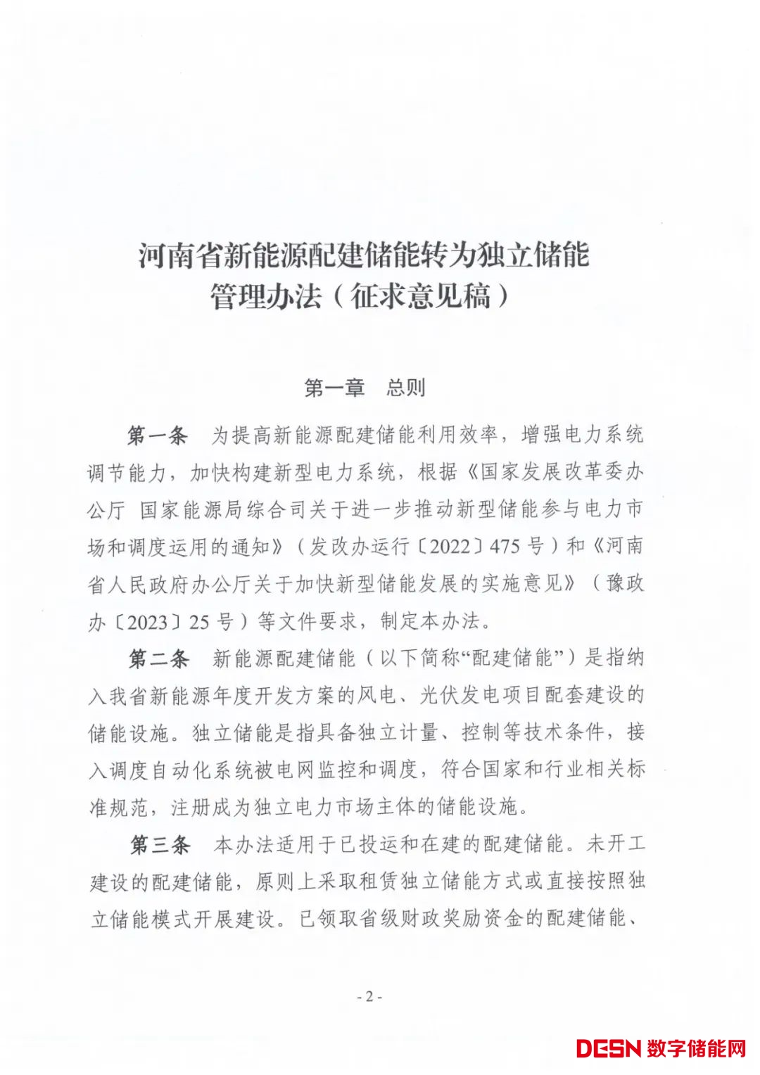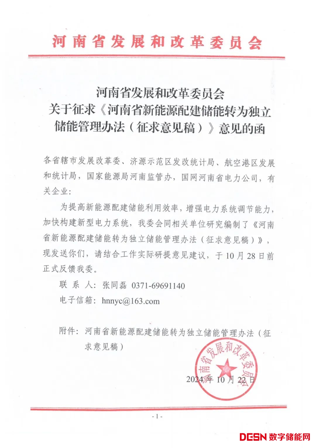 河南省發(fā)改委印發(fā)關(guān)于征求《河南省新能源配建儲(chǔ)能轉(zhuǎn)為獨(dú)立儲(chǔ)能管理辦法(征求意見稿)》意見的函