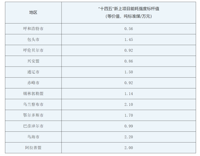 各盟市“十四五”新上項目能耗強度標桿值