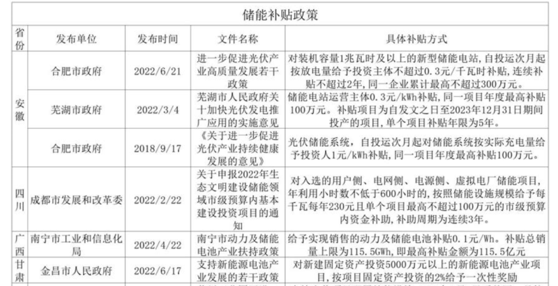 此前,2018年安徽合肥曾發(fā)布關(guān)于進(jìn)一步促進(jìn)光伏產(chǎn)業(yè)持續(xù)健康發(fā)展的意見,意見中指出光伏儲能系統(tǒng),自投運(yùn)次月起對儲能系統(tǒng)按實(shí)際充電量給予投資人1元/kWh補(bǔ)貼,同一項(xiàng)目年度最高補(bǔ)貼100萬元。