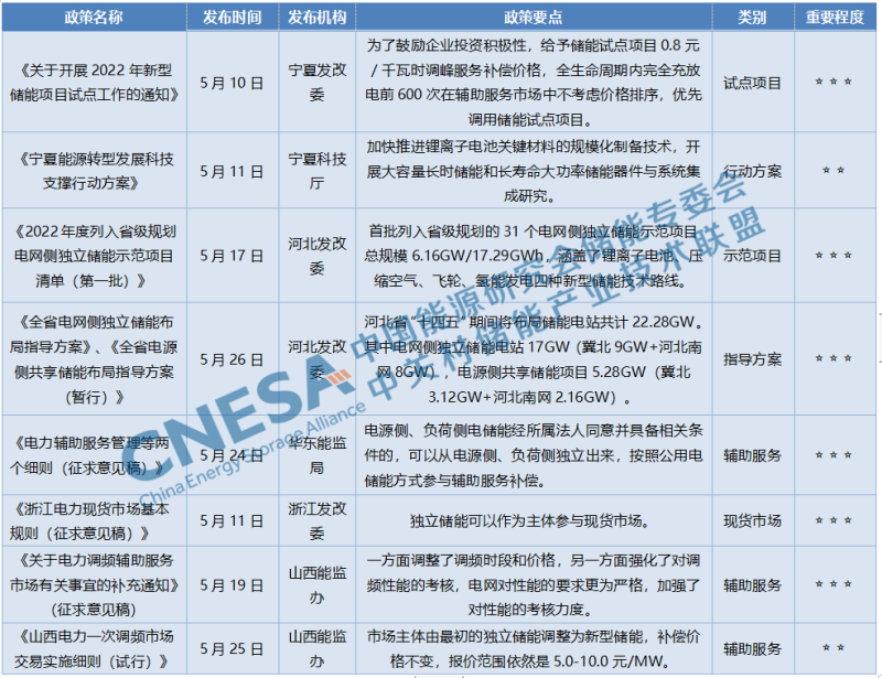 中國儲能網(wǎng)訊:5月儲能政策從國家到地方共有50余項發(fā)布或征求意見,涉及儲能規(guī)劃、可再生能源配置儲能、直接補貼、示范項目、輔助服務市場等方面。