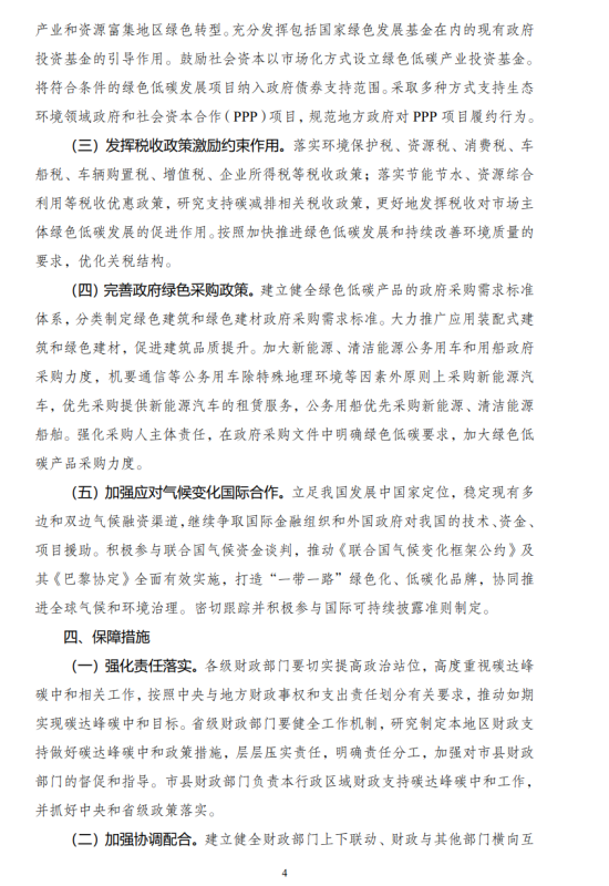 《意見》提到,立足當前,著眼長遠,圍繞如期實現(xiàn)碳達峰碳中和目標,加強財政支持政策與國家“十四五”規(guī)劃綱要銜接,抓住“十四五”碳達峰工作的關鍵期、窗口期,落實積極的財政政策要提升效能,更加注重精準、可持續(xù)的要求,合理規(guī)劃財政支持碳達峰碳中和政策體系。政策框架體系的建立是財政支持碳達峰碳中和工作的基礎,《意見》主要立足當前發(fā)展階段,聚焦“十四五”時期政策體系框架初步建立目標,夯實我國碳達峰碳中和發(fā)展基礎,同時著眼長遠,合理規(guī)劃和完善財政支持碳達峰碳中和政策體系,為如期實現(xiàn)碳達峰碳中和目標做好財政保障。