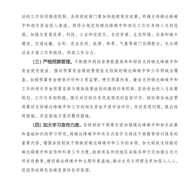 《意見》指出,優(yōu)化財政支出結構,加大對碳達峰碳中和工作的支持力度。財政資金安排緊緊圍繞黨中央、國務院關于碳達峰碳中和有關工作部署,資金分配突出重點,強化對重點行業(yè)領域的保障力度,提高資金政策的精準性。中央財政在分配現(xiàn)有中央對地方相關轉移支付資金時,對推動相關工作成效突出、發(fā)揮示范引領作用的地區(qū)給予獎勵支持。