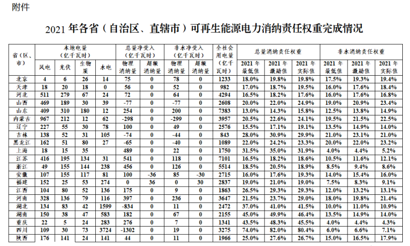 附件:2021年各省(自治區(qū)、直轄市)可再生能源電力消納責(zé)任權(quán)重完成情況