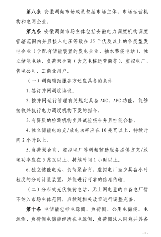 安徽調(diào)頻市場主體包括:安徽電力調(diào)度機構(gòu)調(diào)度管轄范圍內(nèi)并且接入電壓等級在35KV及以上的各類型發(fā)電企業(yè)(含配有儲能裝置的發(fā)電企業(yè)、抽水蓄能電站)、獨立儲能電站、負(fù)荷聚合商(含充電樁運營商等)、虛擬電廠、售電公司、工商業(yè)用戶。