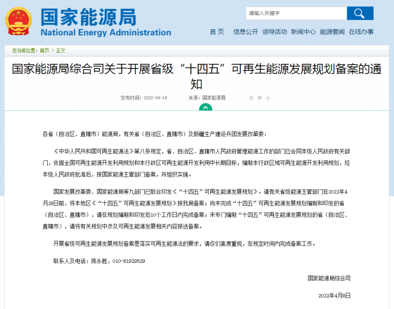 國家發(fā)展改革委、國家能源局等九部門已聯(lián)合印發(fā)《“十四五”可再生能源發(fā)展規(guī)劃》。請(qǐng)有關(guān)省級(jí)能源主管部門在2022年4月28日前,將本地區(qū)《“十四五”可再生能源發(fā)展規(guī)劃》報(bào)我局備案;尚未完成“十四五”可再生能源發(fā)展規(guī)劃編制和印發(fā)的?。ㄗ灾螀^(qū)、直轄市),請(qǐng)?jiān)谝?guī)劃編制和印發(fā)后10個(gè)工作日內(nèi)完成備案;未專門編制“十四五”可再生能源發(fā)展規(guī)劃的?。ㄗ灾螀^(qū)、直轄市),請(qǐng)將有關(guān)規(guī)劃中涉及可再生能源發(fā)展相關(guān)內(nèi)容報(bào)送備案。