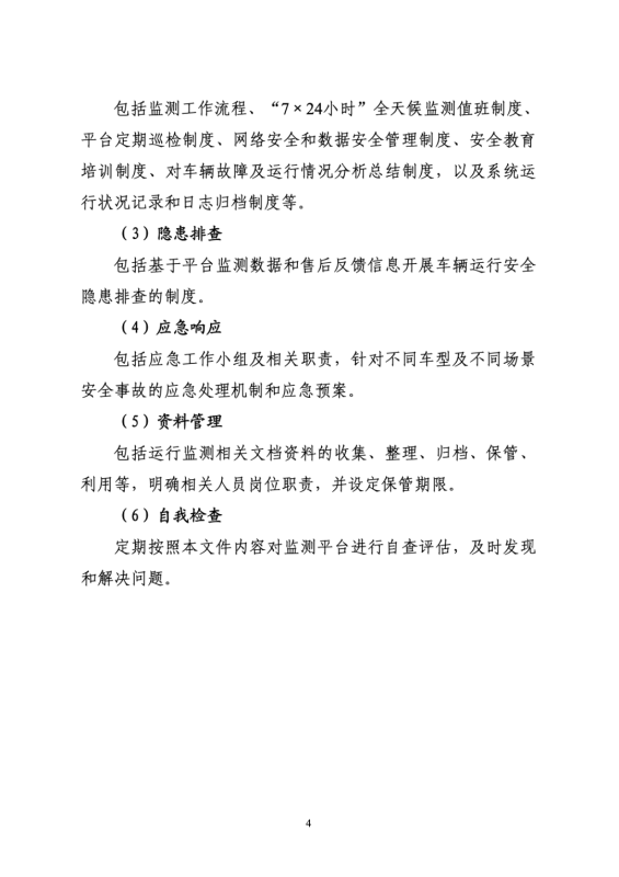 (九)建立隱患車輛排查機(jī)制。鼓勵(lì)企業(yè)加強(qiáng)車輛運(yùn)行安全狀態(tài)隱患排查,及時(shí)跟蹤和確認(rèn)長時(shí)間離線車輛的安全狀態(tài),妥善處理大面積聚集停放、頻繁報(bào)警等存在安全隱患的車輛。