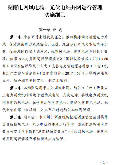 為全面貫徹新發(fā)展理念,推動構(gòu)建湖南新型電力系統(tǒng),保障湖南電力系統(tǒng)安全、優(yōu)質(zhì)、經(jīng)濟(jì)運行,促進(jìn)網(wǎng)源荷儲協(xié)調(diào)發(fā)展,規(guī)范風(fēng)電場、光伏電站并網(wǎng)運行管理,依據(jù)《電力并網(wǎng)運行管理規(guī)定》(國能發(fā)監(jiān)管規(guī)﹝2021﹞60號)等有關(guān)法律法規(guī)和技術(shù)標(biāo)準(zhǔn),我辦組織制定了《湖南電網(wǎng)風(fēng)電場、光伏電站并網(wǎng)運行管理實施細(xì)則》,現(xiàn)印發(fā)你們,請遵照執(zhí)行。