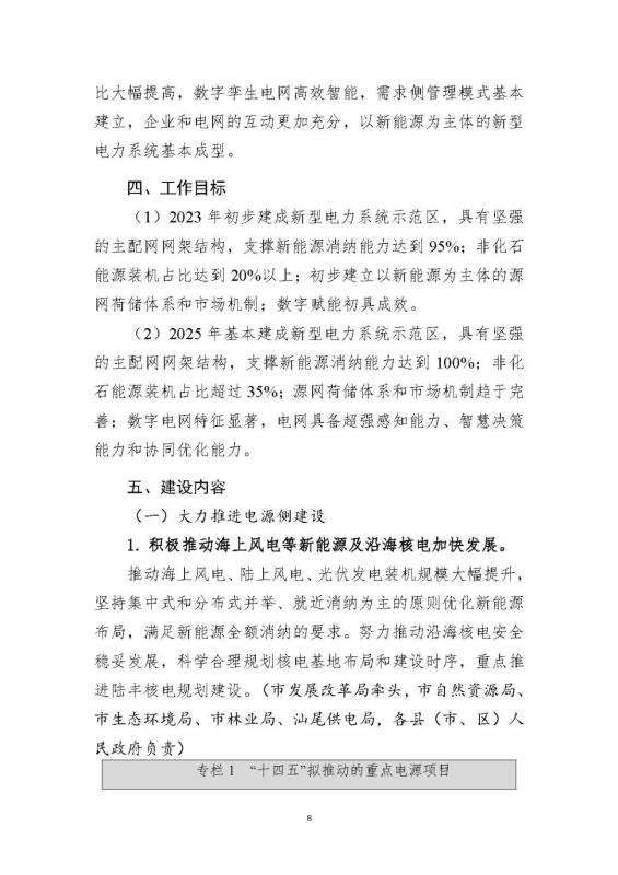 中國儲能網(wǎng)訊:3月2日,汕尾市發(fā)展和改革局發(fā)布關(guān)于公開征求《汕尾市新型電力系統(tǒng)示范區(qū)合作共建行動方案》(征求意見稿)意見和建議的函,提出積極推動實施源網(wǎng)荷儲一體化、多能互補項目建設。