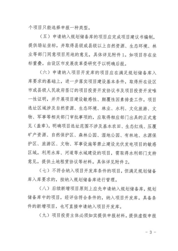 根據(jù)文件要求,集中式光伏發(fā)電規(guī)劃項(xiàng)目庫(kù)分為開(kāi)發(fā)庫(kù)和儲(chǔ)備庫(kù)兩類(lèi)。正在開(kāi)展前期工作,初步落實(shí)土地條件的項(xiàng)目可納入儲(chǔ)備庫(kù);前期工作比較完善,支持文件完備,且簽訂項(xiàng)目投資開(kāi)發(fā)協(xié)議并已落實(shí)用地的項(xiàng)目可納入開(kāi)發(fā)庫(kù)。未列入項(xiàng)目開(kāi)發(fā)庫(kù)的集中式光伏發(fā)電項(xiàng)目,原則上不得參與新能源建設(shè)年度競(jìng)爭(zhēng)性配置。