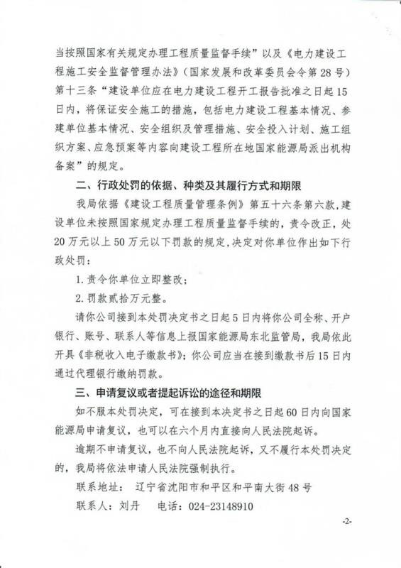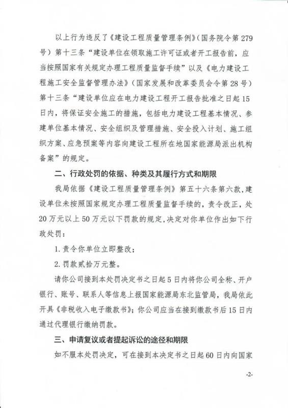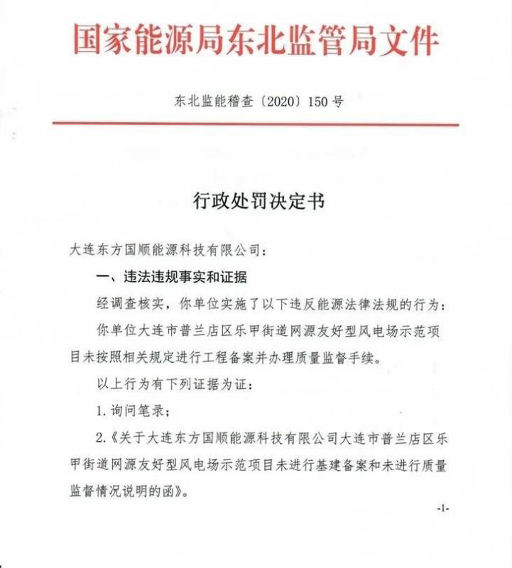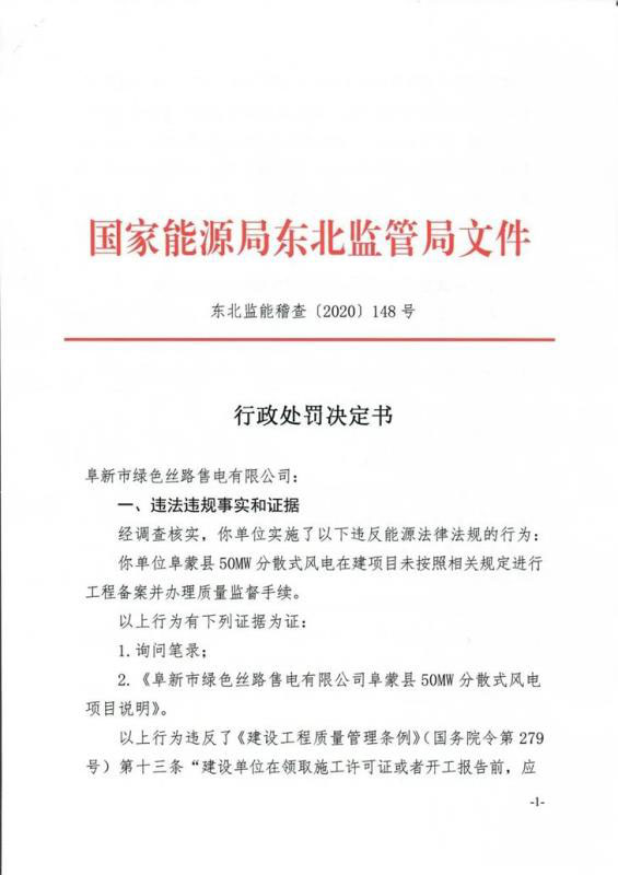 中國儲(chǔ)能網(wǎng)訊:近期國家能源局東北監(jiān)管局相繼發(fā)布四條行政處罰決定書,涉及4家能源企業(yè)的5個(gè)風(fēng)電項(xiàng)目,分別為:大連東方國順能源科技有限公司,大連市普蘭店區(qū)樂甲街道網(wǎng)源友好型風(fēng)電場(chǎng)示范項(xiàng)目;阜新市綠色絲路售電有限公司,阜蒙縣50MW分散式風(fēng)電在建項(xiàng)目;阜新招聯(lián)綠昌風(fēng)力發(fā)電有限公司,阜蒙40MW分散式風(fēng)電在建項(xiàng)目;國電和風(fēng)風(fēng)電開發(fā)有限公司芳山分公司,在建的黑山景家49.5MW風(fēng)電項(xiàng)目&國電黑山水泉49.5MW風(fēng)電項(xiàng)目。