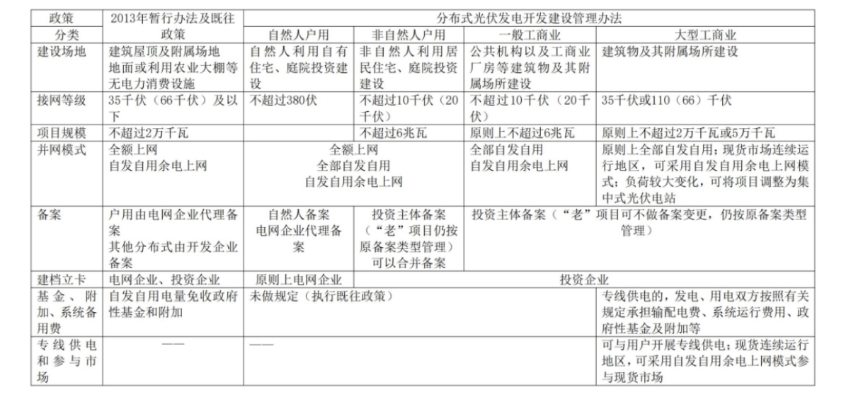 細(xì)化分布式光伏分類,體現(xiàn)精細(xì)化、差異化管理方向?!豆芾磙k法》第四條基于建設(shè)場(chǎng)所、裝機(jī)容量、電壓等級(jí)將分布式光伏項(xiàng)目劃分為自然人戶用、非自然人戶用、一般工商業(yè)和大型工商業(yè)四種類型,后續(xù)條款則針對(duì)這四類分布式光伏提出了備案管理、消納模式、電網(wǎng)服務(wù)等差異化規(guī)定要求(見附表),以實(shí)現(xiàn)精準(zhǔn)精細(xì)管理,符合不同性質(zhì)和形式的分布式光伏項(xiàng)目開發(fā)建設(shè)和商業(yè)運(yùn)行需求。如,此前對(duì)于戶用光伏沒(méi)有明確的接網(wǎng)電壓等級(jí)和容量的規(guī)定,出現(xiàn)采用自然人申請(qǐng)但實(shí)際建設(shè)在廠區(qū)、裝機(jī)高至數(shù)百千瓦的戶用光伏系統(tǒng)的情況,再如一些企業(yè)集中采用租賃屋頂方式開發(fā)運(yùn)營(yíng)的戶用光伏,由于沒(méi)有明確的規(guī)定,各地采取的管理方式不一,且隨著分布式光伏滲透率增加地方采取的方式變化,引發(fā)爭(zhēng)議?!豆芾磙k法》將自然人戶用和非自然人戶用做了清晰的界定,并通過(guò)分類規(guī)范管理措施,解決了這一問(wèn)題。