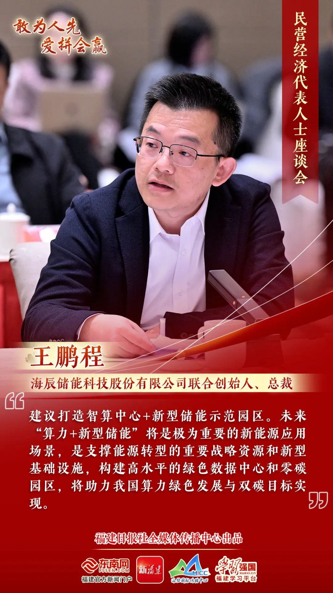 會議期間,省委省政府領導認真聽取了民營經濟代表人士的意見建議。海辰儲能聯合創(chuàng)始人、總裁王鵬程在會上發(fā)表了“專注儲能,鍛造福建綠色發(fā)展創(chuàng)新高地”的建議,分享了公司在儲能領域的高質量發(fā)展經驗。王鵬程提到,海辰儲能創(chuàng)立五年來,公司始終專注于做好儲能這一件事,積極搶抓發(fā)展機遇,推進國際化進程,持續(xù)穩(wěn)健經營,取得了高質量發(fā)展: