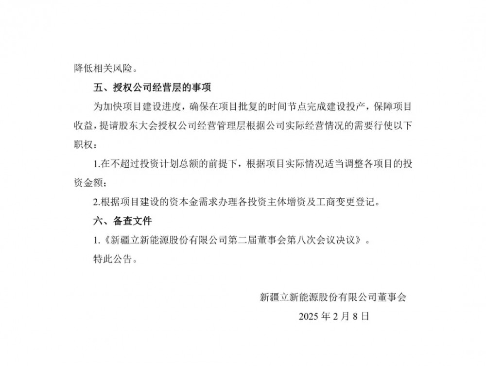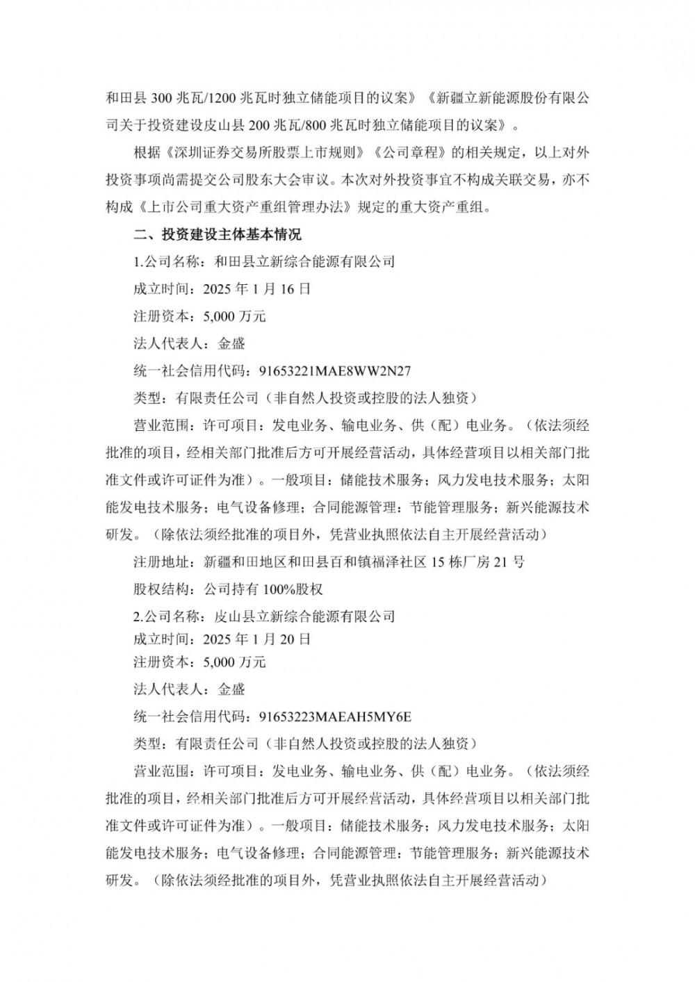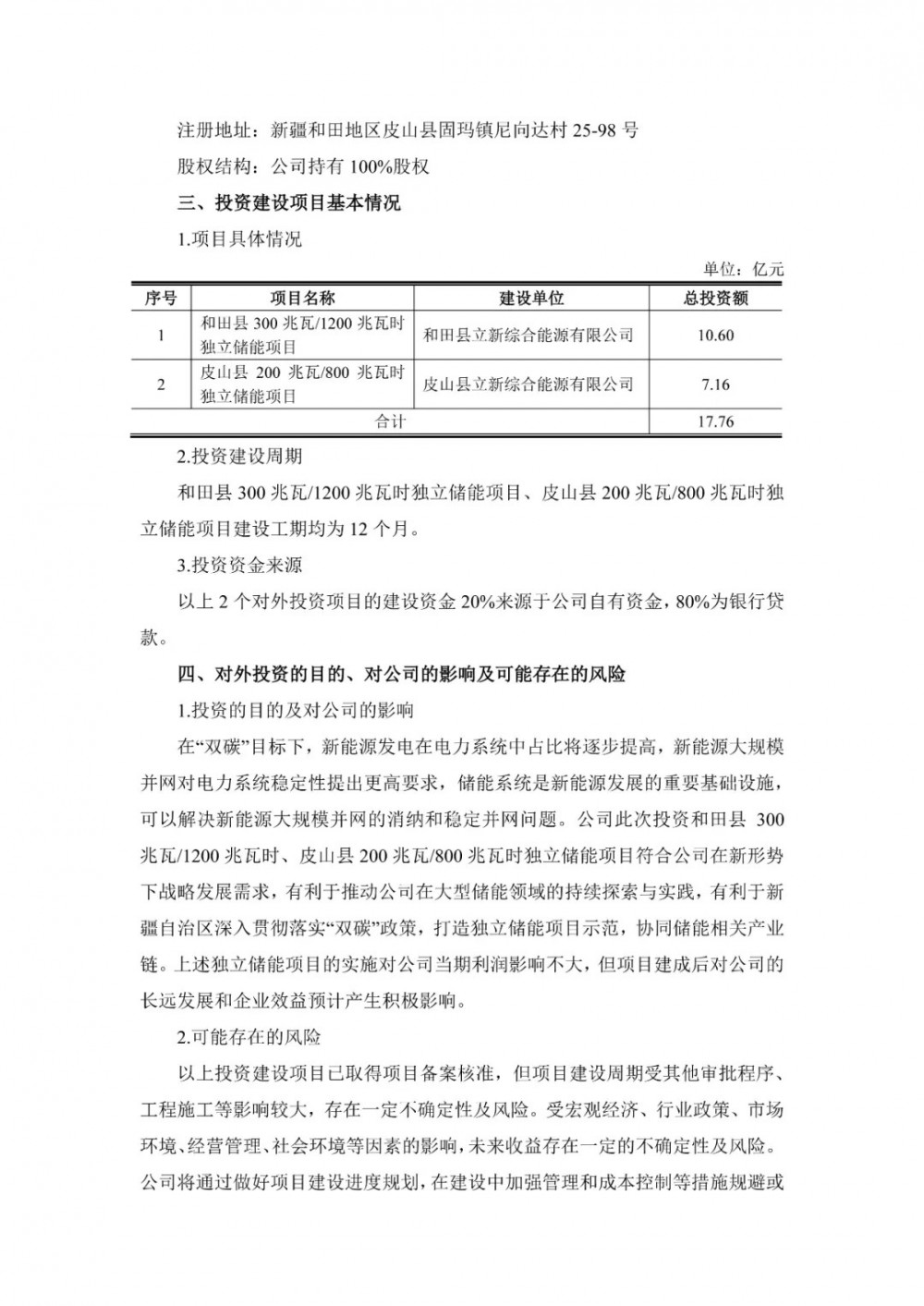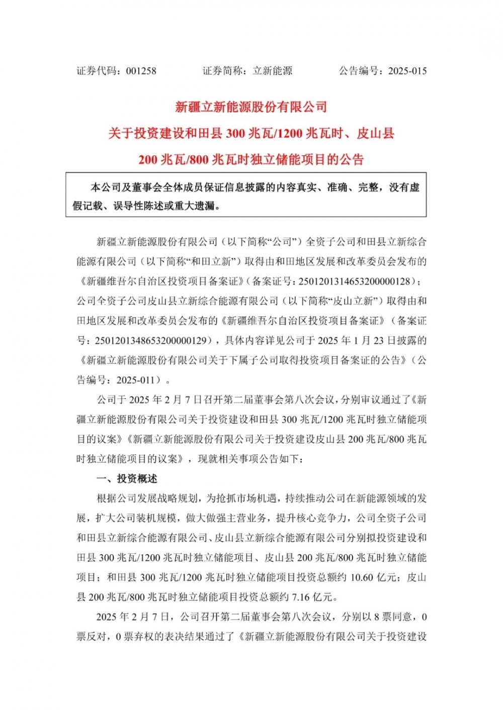 中國儲能網(wǎng)訊:2月7日,立新能源公告,公司全資子公司和田縣立新綜合能源有限公司、皮山縣立新綜合能源有限公司分別擬投資建設(shè)和田縣300兆瓦/1200兆瓦時(shí)獨(dú)立儲能項(xiàng)目、皮山縣200兆瓦/800兆瓦時(shí)獨(dú)立儲能項(xiàng)目。