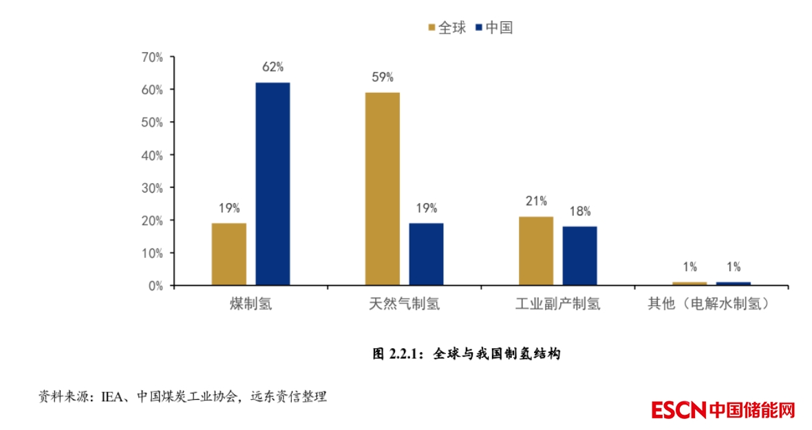 目前全球主流的制氫方式是甲烷水蒸氣催化重整工藝(SMR),SMR 是指在一定的反應(yīng)條件下, 使用催化劑促使甲烷的 C-H 鍵斷裂,并重新組合生成新的化學(xué)鍵過(guò)程,具有工藝簡(jiǎn)單、成熟等優(yōu)點(diǎn),但我國(guó)因資源稟賦的特點(diǎn),仍以煤制氫的方式為主,相較于 SMR 工藝排放的二氧化碳更多,而電解水低碳環(huán)保的制氫方式我國(guó)和全球其他國(guó) 家占比都不到 1%。