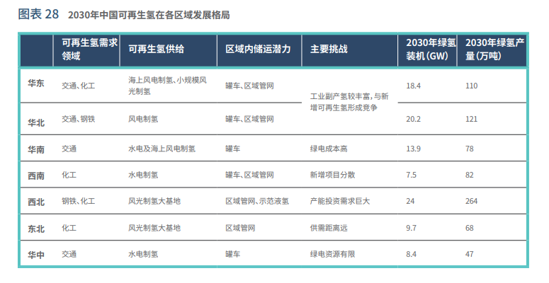 考慮到傳統(tǒng)產(chǎn)業(yè)轉(zhuǎn)型速度、自然資源稟賦、可再生氫能利用程度等因素,2030年中國可再生氫生產(chǎn)裝機(jī)在各區(qū)域之間的分布模式將呈現(xiàn)以下特點(diǎn):