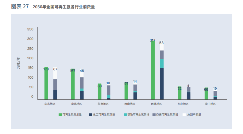 根據(jù)測算,2030年,化工行業(yè)總可再生氫消費(fèi)量將達(dá)到376萬噸,是中國最大的可再生氫需求市場。其中,西北地區(qū)由于具備化工產(chǎn)業(yè)及可再生電力資源優(yōu)勢,將成為最大的化工可再生氫消費(fèi)地,其次分別是華東、東北和西南地區(qū)。