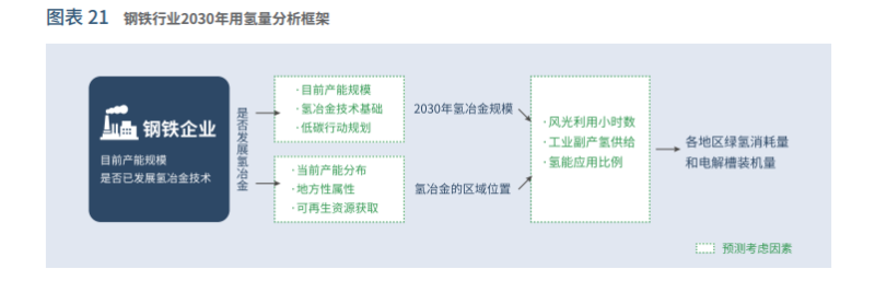 近年來國內(nèi)各個(gè)大型鋼鐵企業(yè)氫冶金技術(shù)工藝試點(diǎn)項(xiàng)目如圖表20所示?;谏鲜隹紤],對(duì)氫冶金項(xiàng)目產(chǎn)能的規(guī)模和區(qū)域位置進(jìn)行估算,并結(jié)合不同地區(qū)電解槽的利用小時(shí)和工業(yè)副產(chǎn)氫供給等因素確定各地區(qū)的可再生氫消耗量和電解槽裝機(jī)需求。