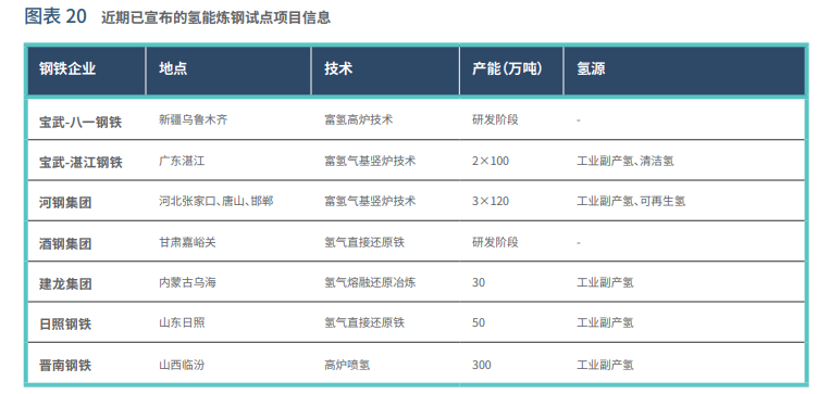 鋼鐵行業(yè)對(duì)可再生氫的利用集中在新增產(chǎn)能生產(chǎn)工藝流程,行業(yè)領(lǐng)先企業(yè)占據(jù)先發(fā)地位。根據(jù)不同煉鐵工藝,氫冶金的主要應(yīng)用場景可分為三類,如圖表19所示。
