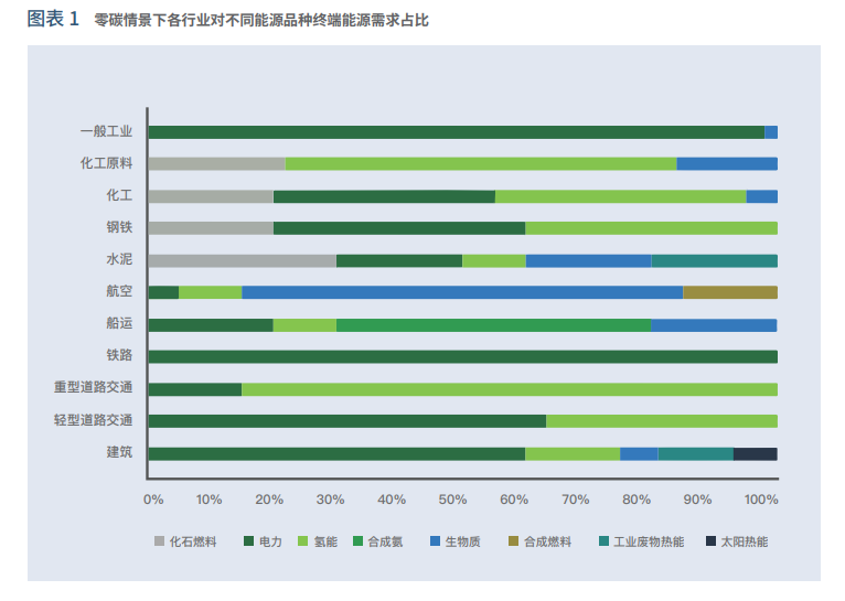 其中,可再生電力的大規(guī)模供給和消費(fèi)側(cè)全面電氣化進(jìn)程將加速,與此同時(shí),重工業(yè)和船運(yùn)、航空等高排放行業(yè)對(duì)化石能源存在一定的依賴,在技術(shù)可行性和成本的角度看,難以實(shí)現(xiàn)大規(guī)??稍偕娏μ娲?,其轉(zhuǎn)型路徑將依靠以氫能、生物質(zhì)、合成燃料為代表的新型清潔燃料。