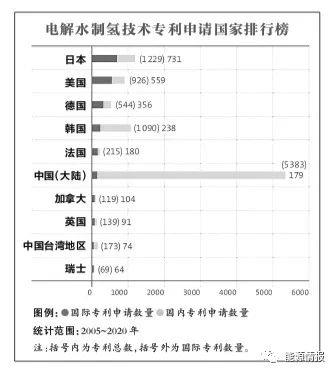 電解水制氫相關(guān)專利數(shù)量增長主要來自中國,中國申請人主要關(guān)注國內(nèi)市場,中國申請的相關(guān)專利中僅3%為國際專利。從專利申請總數(shù)來看,排在中國之后的依次是日本、韓國、美國、德國和法國。歐盟此前推出了氫能發(fā)展戰(zhàn)略,將綠氫作為發(fā)展的重點,歐洲國家專利申請數(shù)量也居于前列。