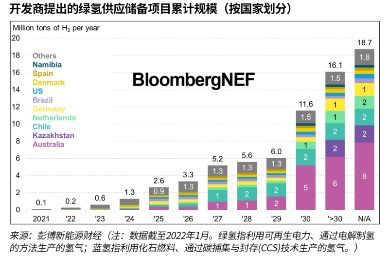 澳大利亞擁有豐富的可再生能源和化石燃料資源。根據(jù)彭博新能源財(cái)經(jīng)統(tǒng)計(jì),相關(guān)公司正利用上述優(yōu)勢,提出年產(chǎn)能可能達(dá)到780萬噸的綠氫項(xiàng)目。藍(lán)氫項(xiàng)目可能會使該年產(chǎn)能進(jìn)一步增加70萬噸。
